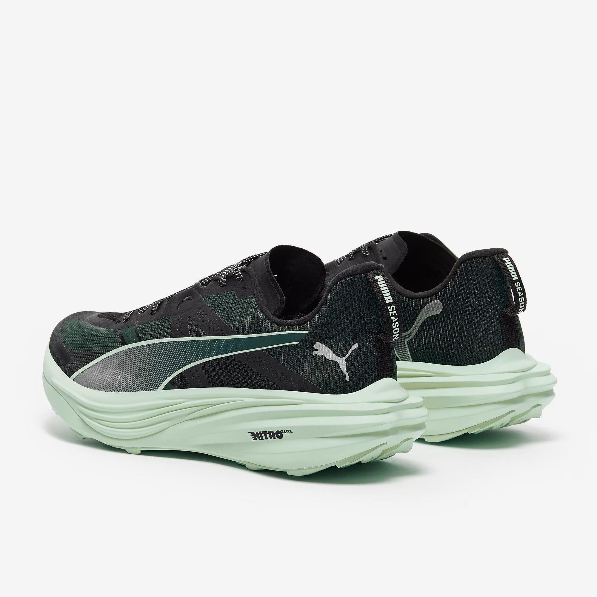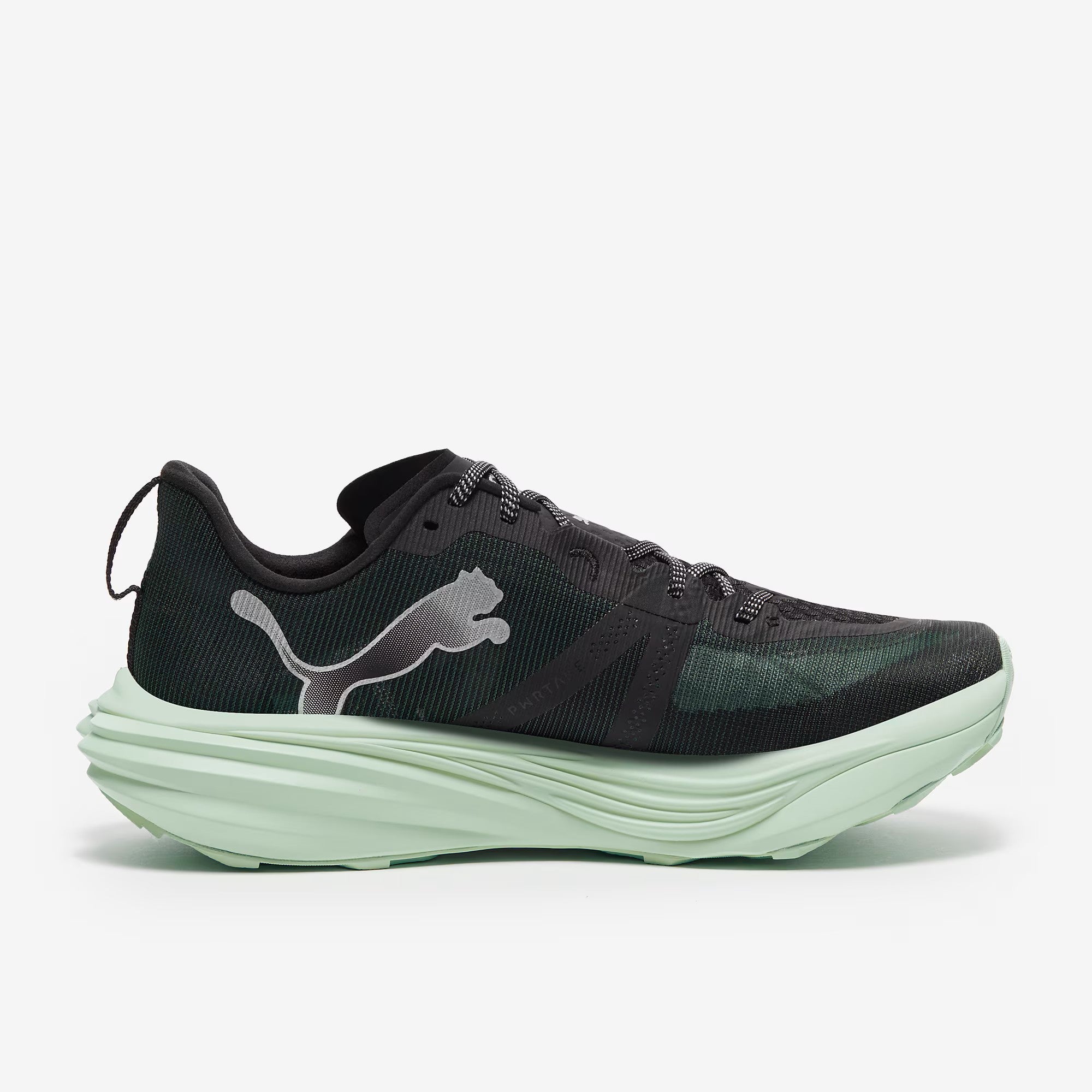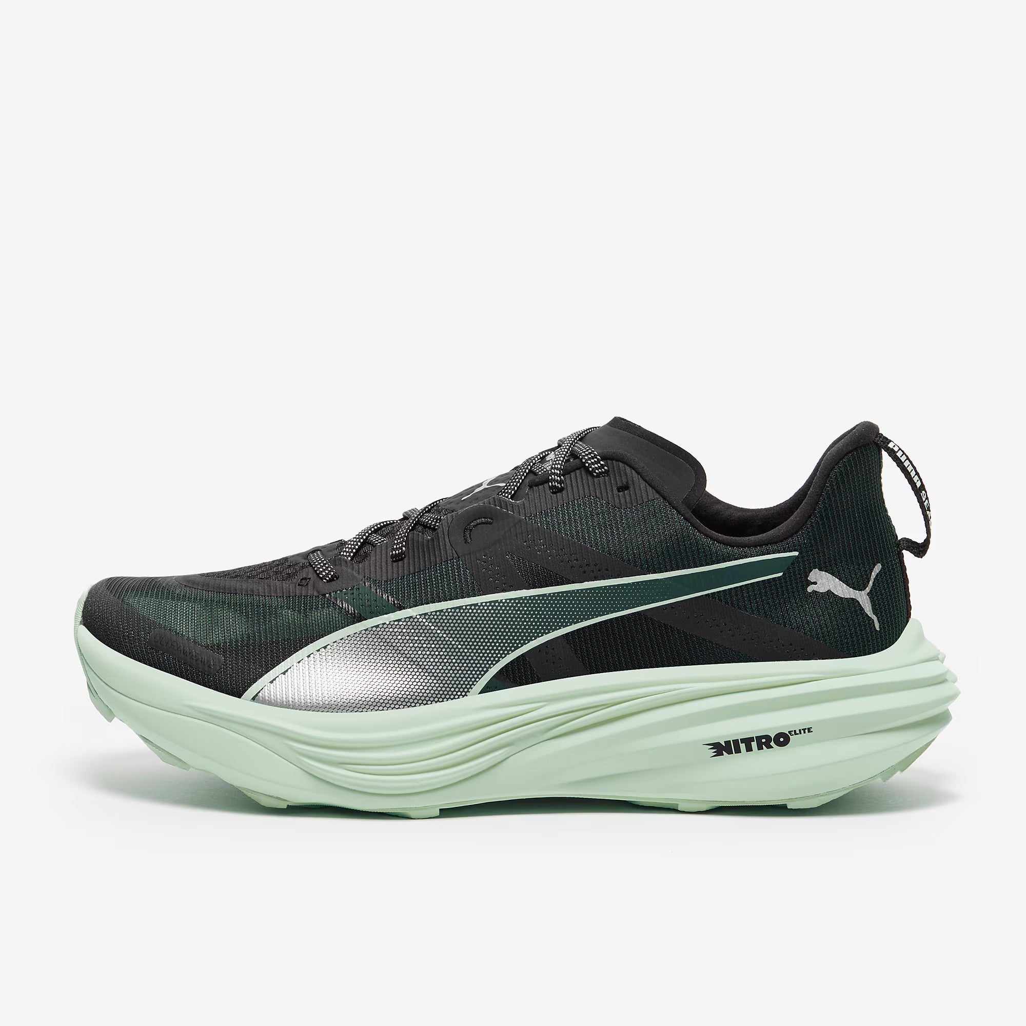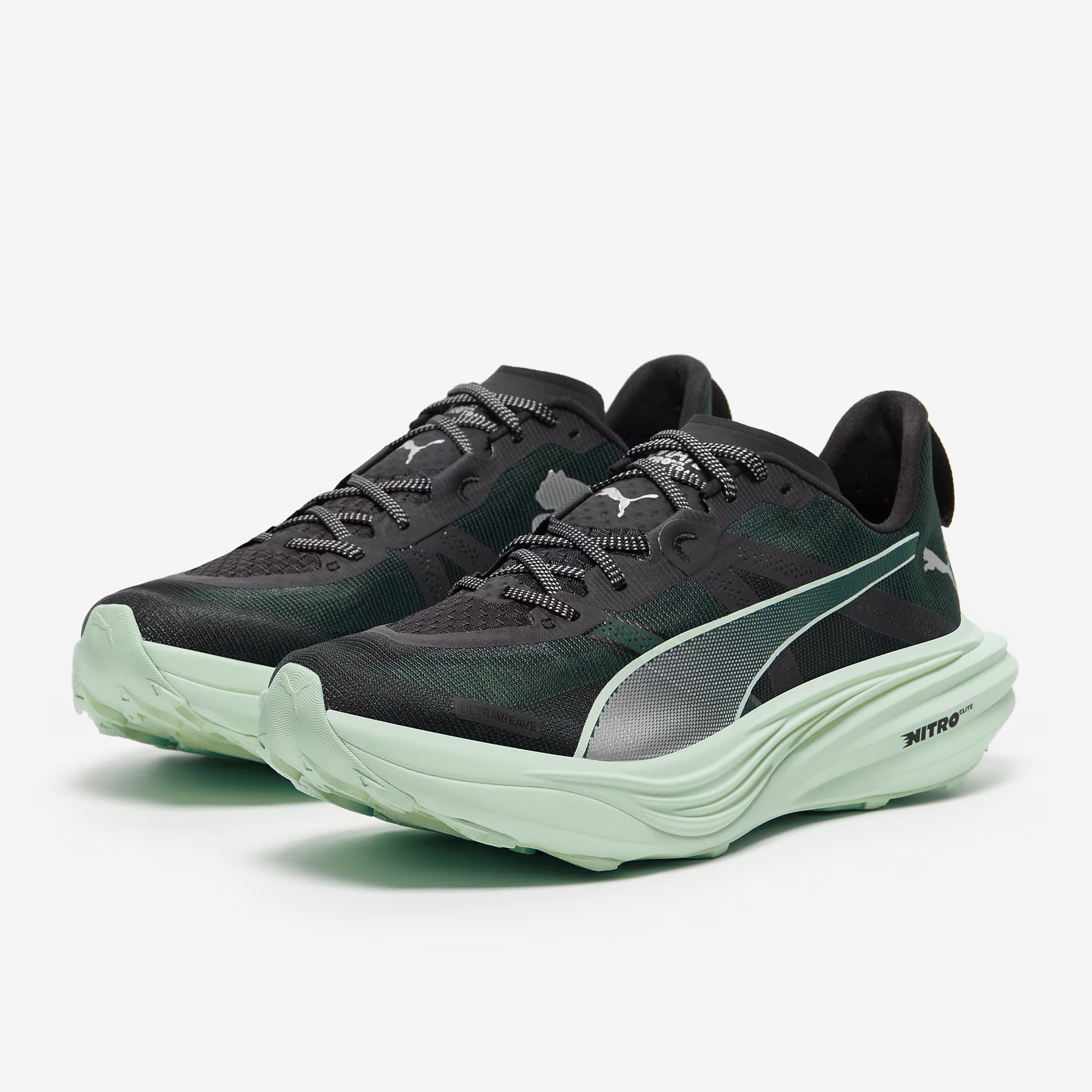With carbon fibre and elite cushioning in the midsole, the PUMA Deviate Nitro Elite Trail in Green Terrain/Mint Melt is their fastest trail shoe, designed to push boundaries in both performance and distance.