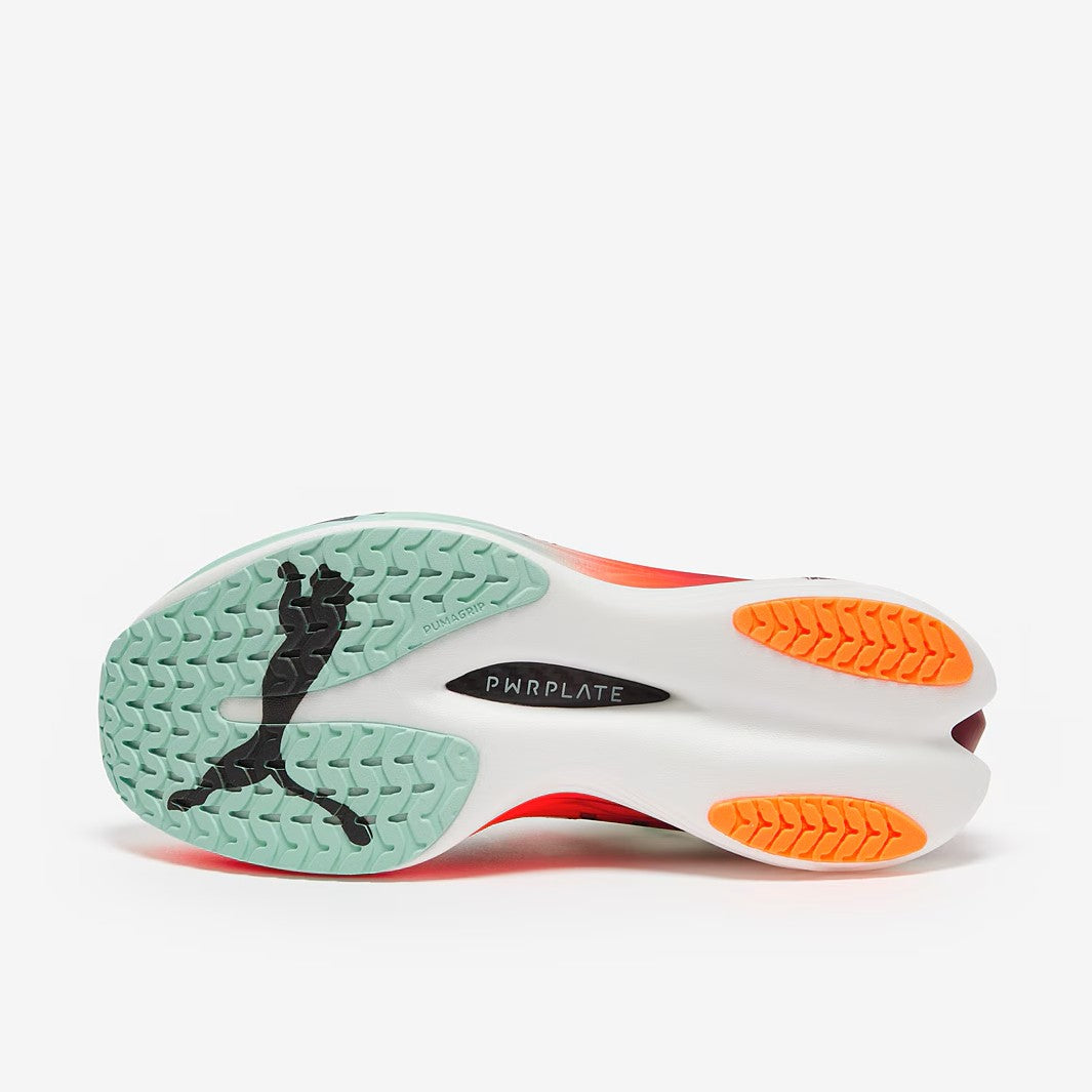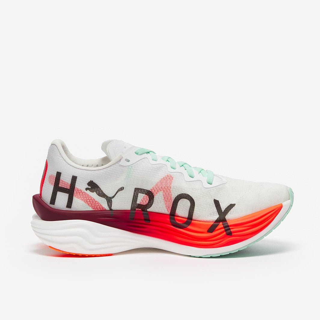 Somehow managing to both lose weight, and gain stack height, the PUMA Women's Deviate Nitro Elite 3 HYROX in Puma White/Glowing Red/Mint Melt is a race day super star seen on the feet of professional athletes across the marathon and half marathon distances.