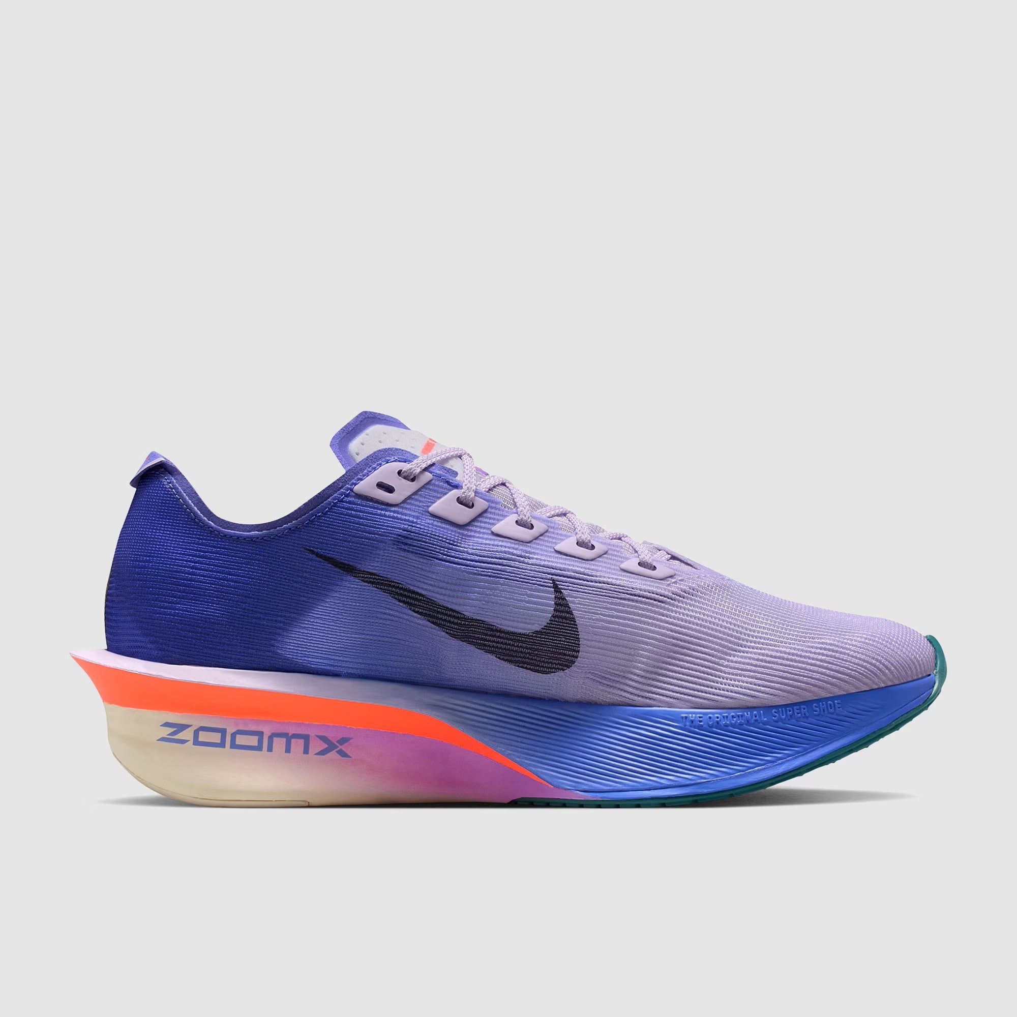 The original, and now the most versatile super shoe on the streets, the Nike Women’s ZoomX Vaporfly Next% 4 in Violet Mist/Purple Dynasty/Persina Violet/Hot Lava/Brt Violet/Mineral Slate is built to give you the edge over anything from 10k to the marathon.